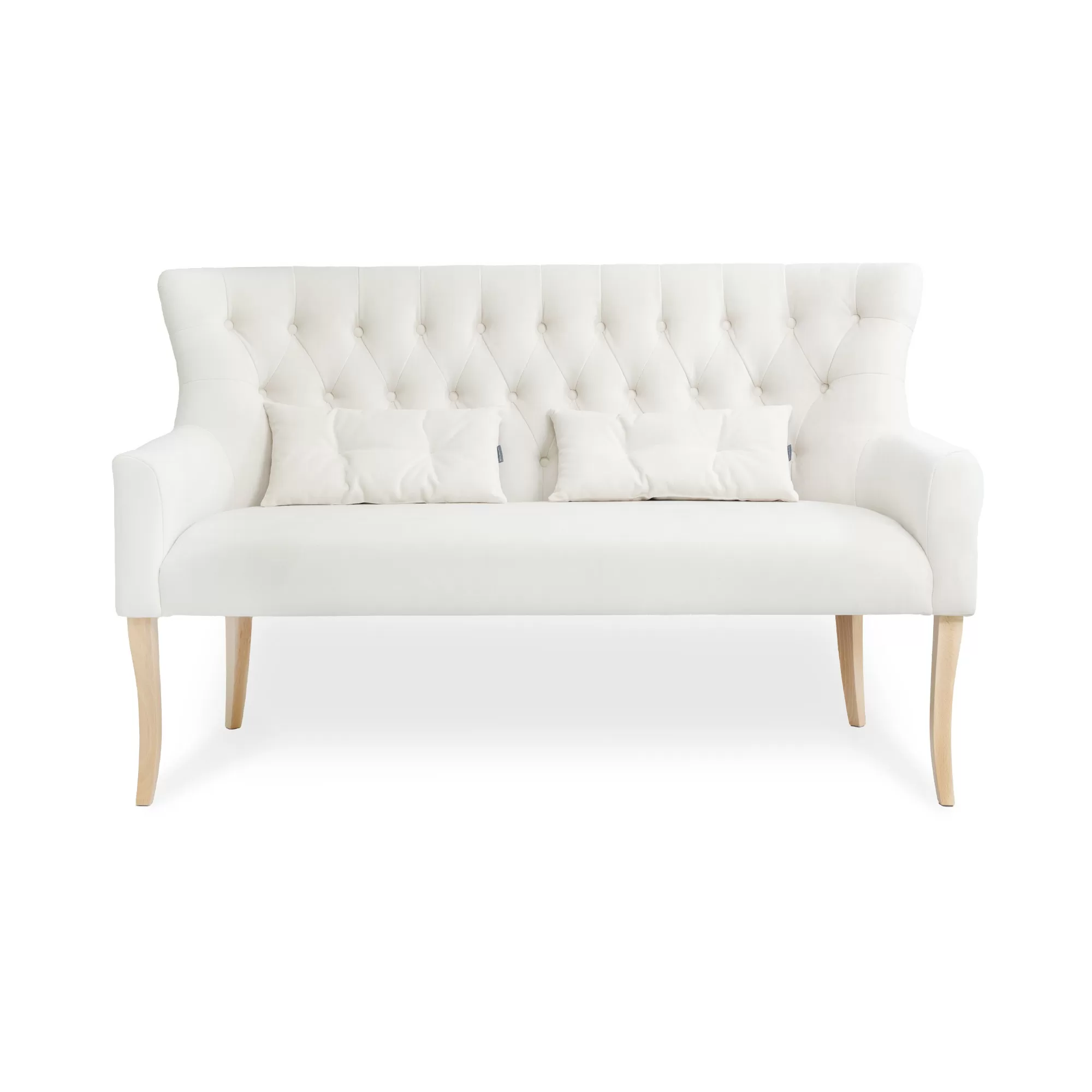 Миниатюрный двухместный диванчик НИКА — эффектное интерьерное решение с ненавязчивым налетом классики в имитации техники каретной стяжки и акцентном декоративном канте.
