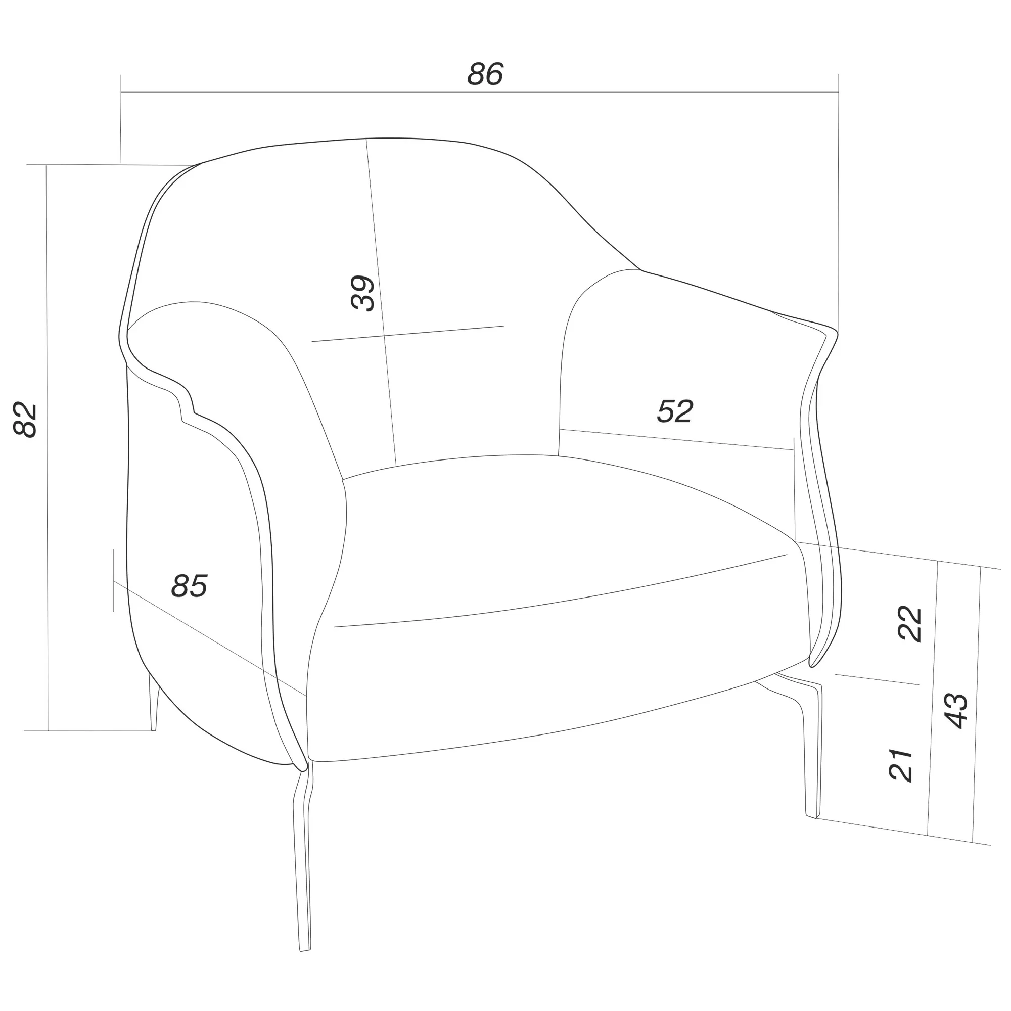 Интерьерное кресло АСТИ имеет объемную форму с невысокой линией спинки, плавно перетекающей с изящные подлокотники.